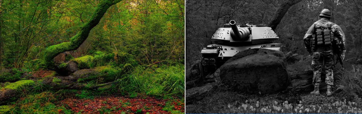 아래는 숲(왼쪽) 이미지에 프롬프트 입력(군인과 탱크)으로 생성하고, 조정 레이어를 선택하고 흑백으로 보정하였습니다.