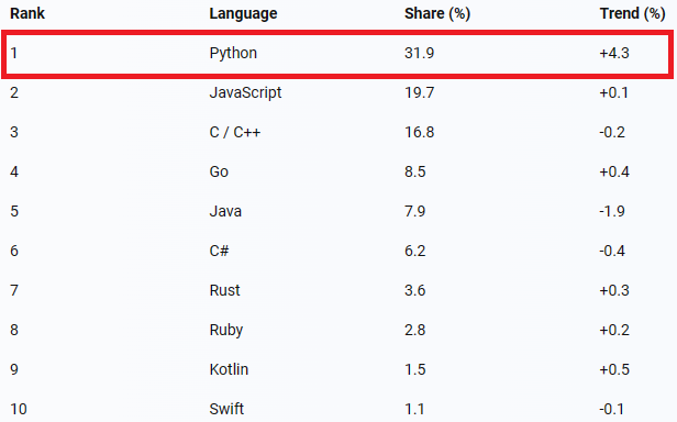 PYPL 지수는 구글에서 언어 튜토리얼을 얼마나 검색하는지 분석하여 만든 지수로, 아래 표는 PYPL 지수를 기준으로 한 2023년 올해 프로그래밍 인기순위 입니다.